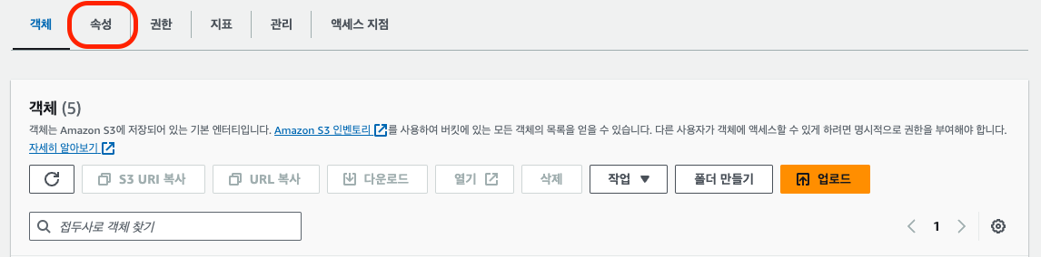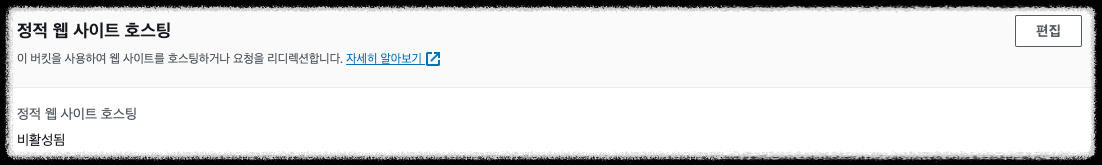 업로드된 Bucket의 속성(properties) 탭에서 맨아래로 내리면 정적 웹 사이트 호스팅이 있다.