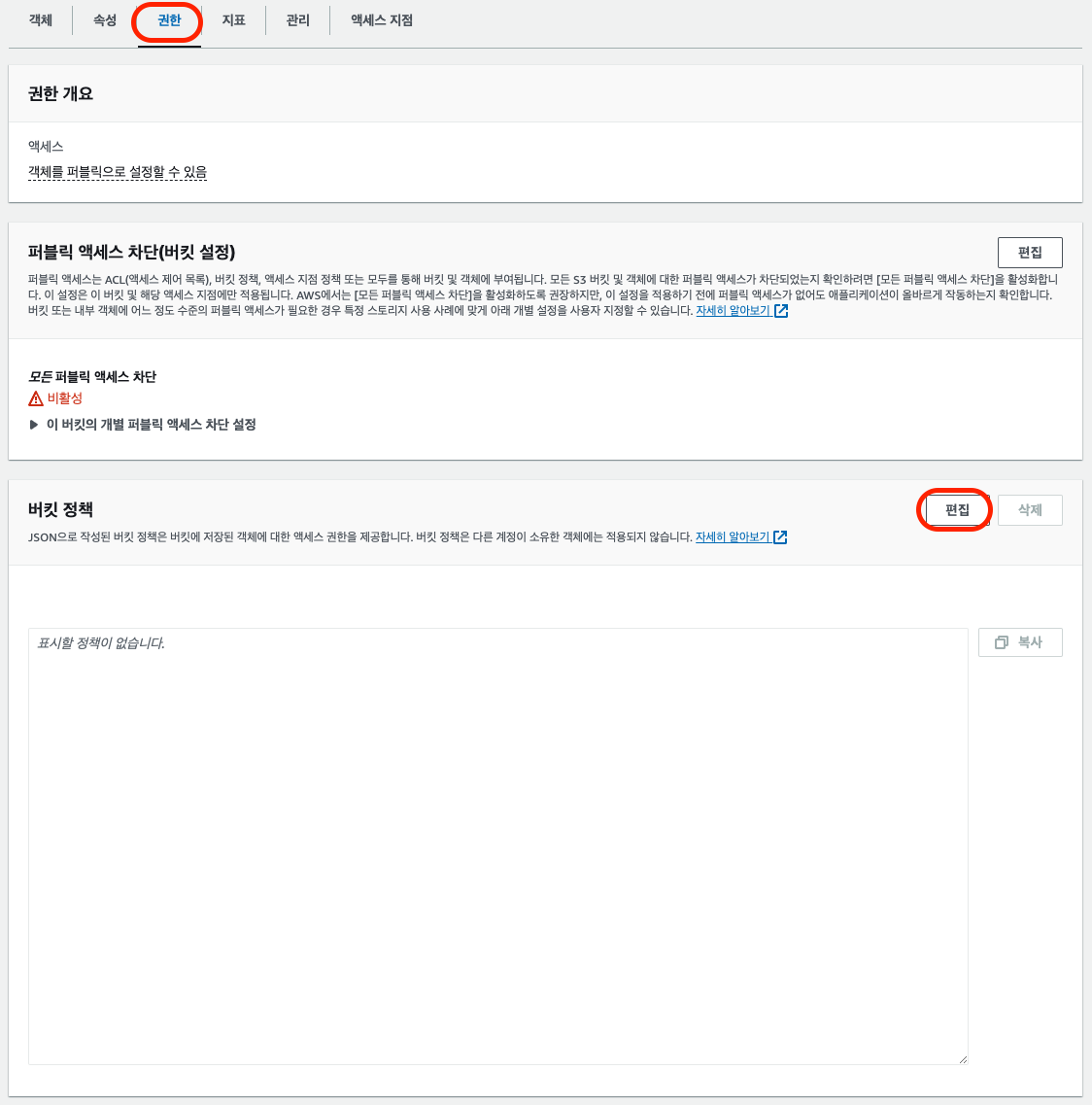 밑으로 내려보면 버킷 정책이 텅 비어있는 것을 볼 수 있는데 편집을 누르고 정책을 입력하고 저장하면 된다.