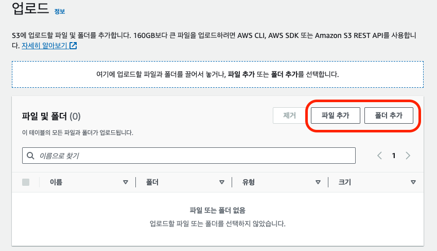 생성된 bucket 명을 클릭해서 파일을 업로드 한다.