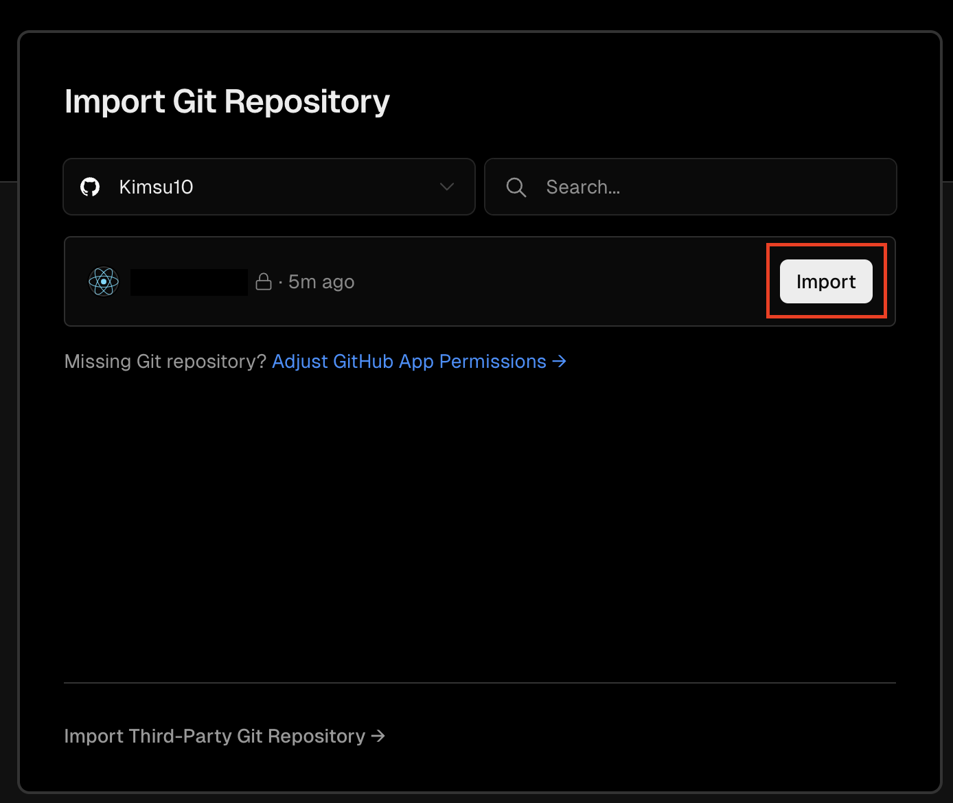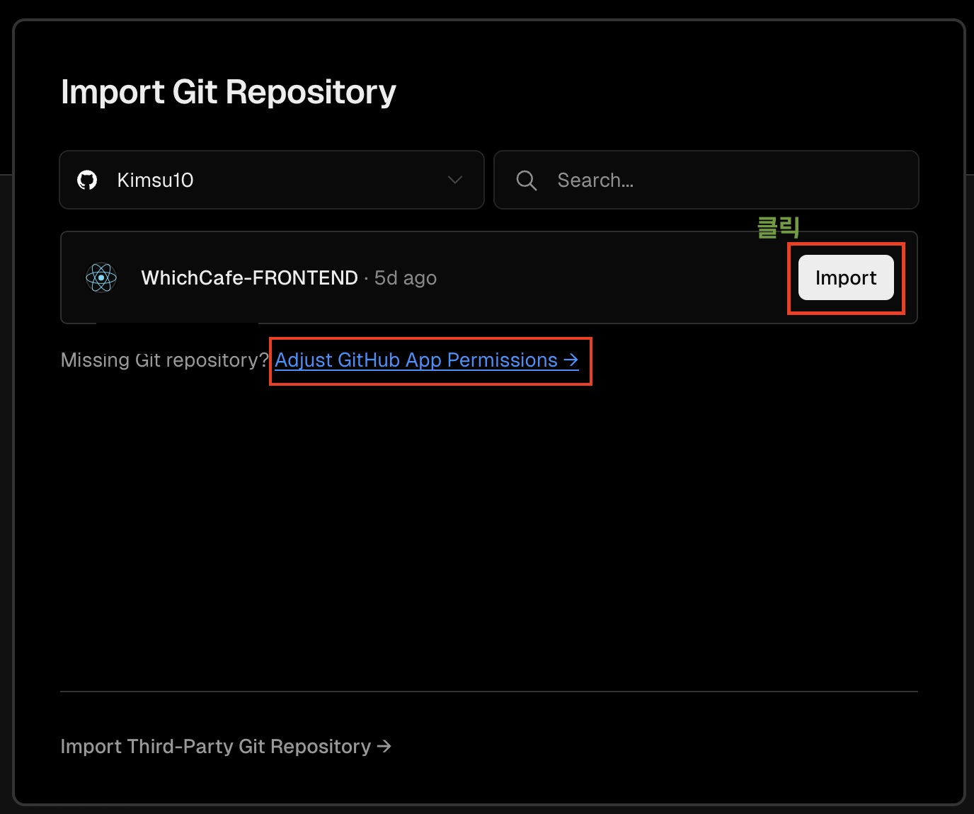 내경우 import를 클릭했을때 원하는 레포가 안보여서 Adjust GitHub App Permissions를 클릭하고 재로그인함