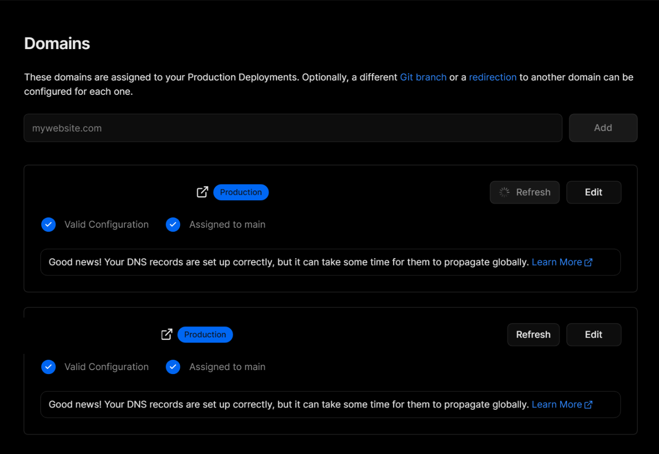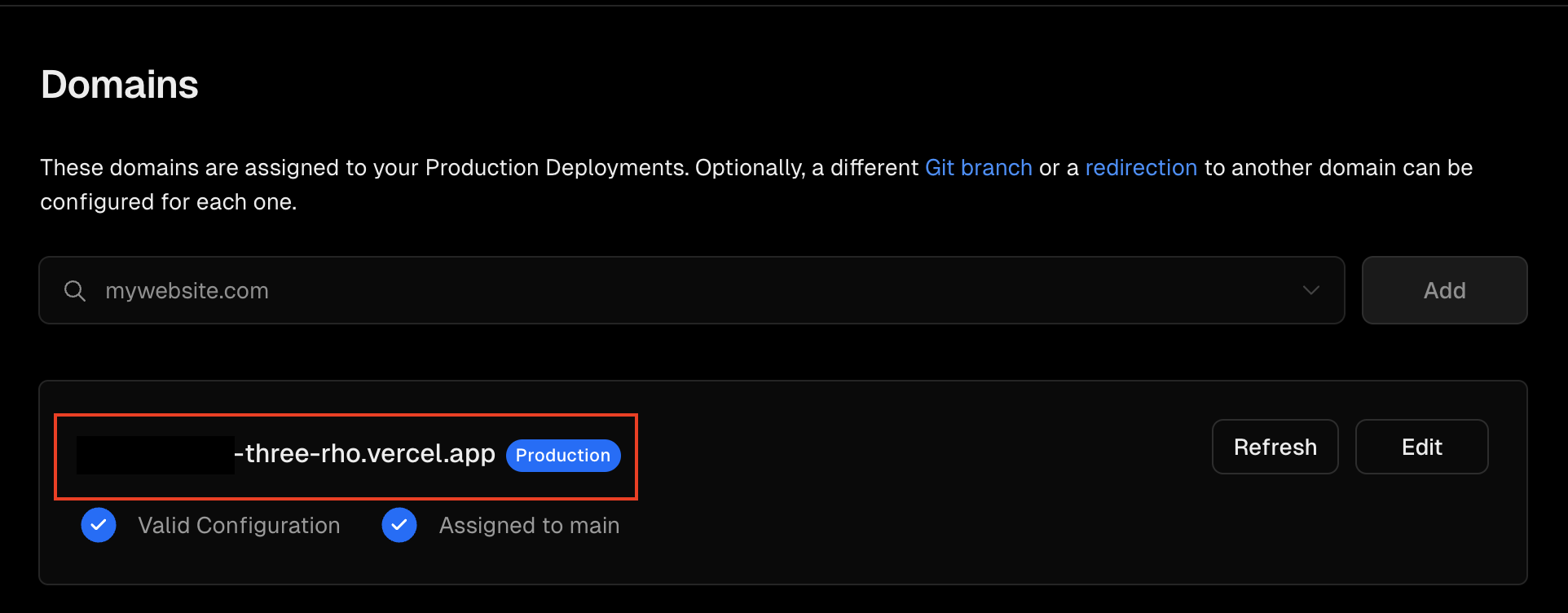 Vercel로 돌아와서 도메인을 확인하면 적용된것을 확인 할 수 있다.
