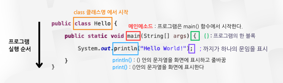 | class명 | 클래스의 이름을 의미하며, 자바에서는 클래스 이름이 파일 이름과 동일해야한다. |