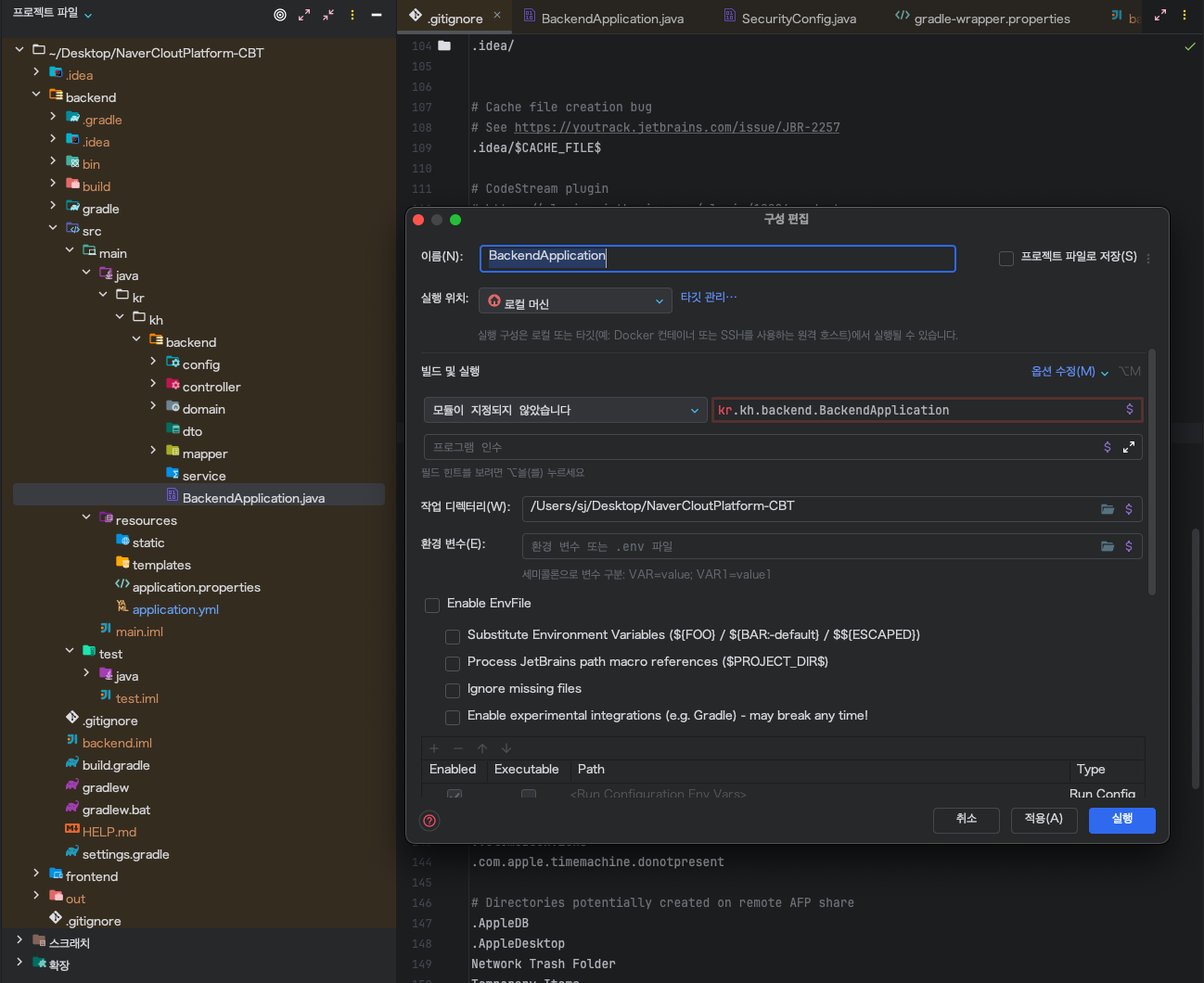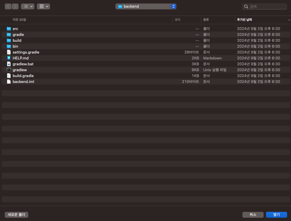 삼성노트북으로 작업하던 프로젝트를 맥에서 하기위해 git에서 레포지토리를 클론하고 intellij에서 폴더를 오픈하였다.