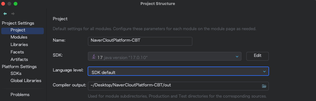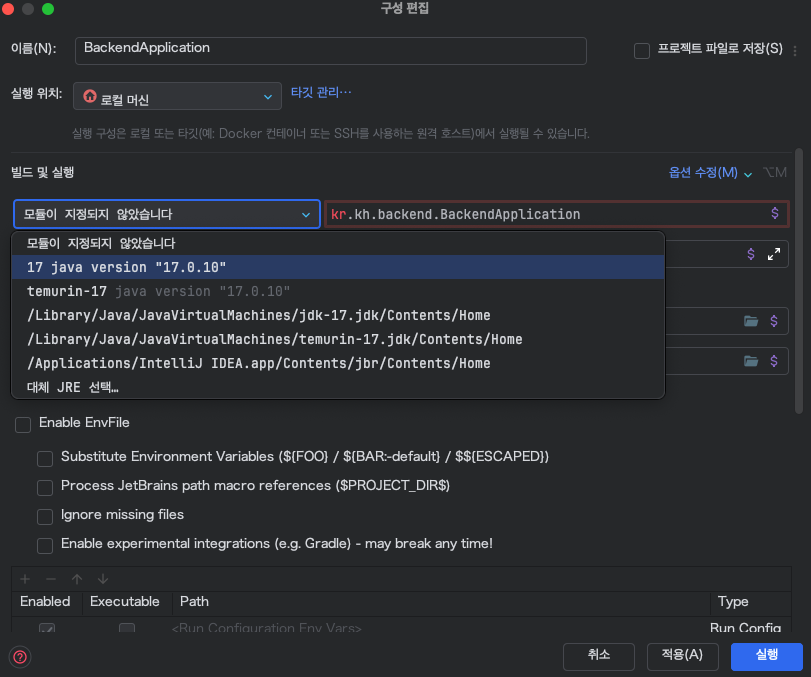 다시 java 17 버전을 선택하고, 프로젝트 구조에서 모듈설정 후 실행!