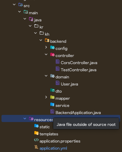 일단 마우스를 올려보니 java file outside of source root 라면서 main 클래스가 실행되지 않는다.
