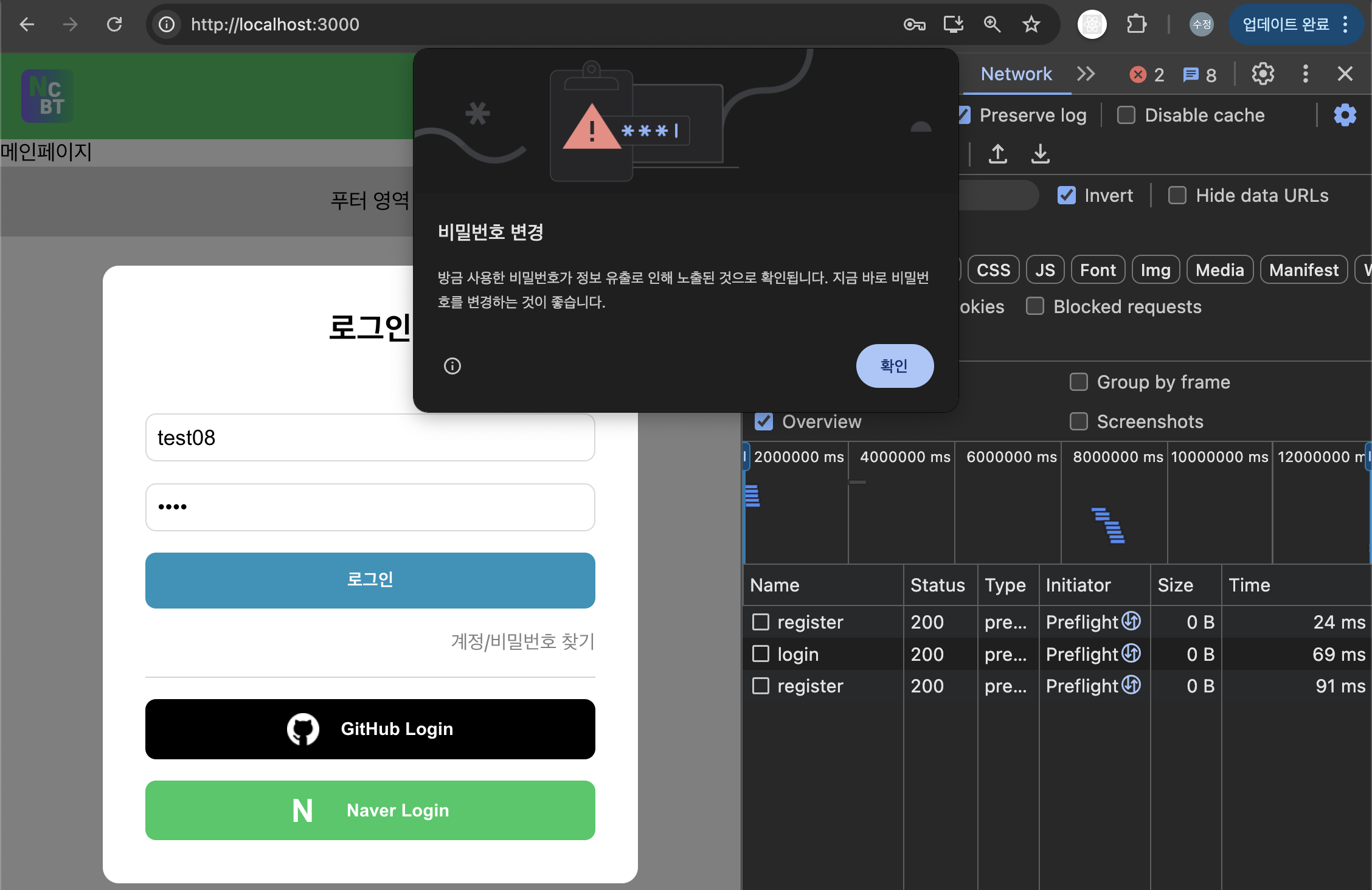 다시 리엑트로 회원가입 버튼을 클릭해보니 다른 문제가 발생하였다.
