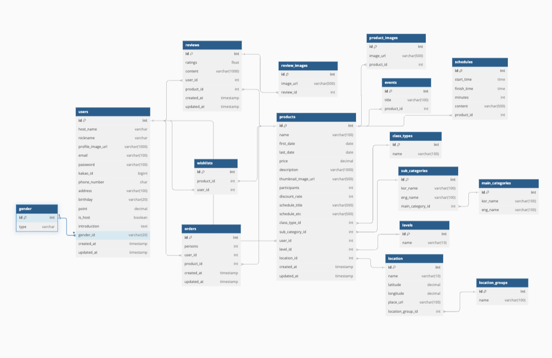 우리팀이 모델링하게된 사이트는 술담화로 카테고리가 굉장히 많았다. 그래서 초반에 백엔드와 프론트가 함께 의논하여 어떤 기능을 넣을지 의논하였고 기획안을 통과하여 ERD 설계를 하였다.