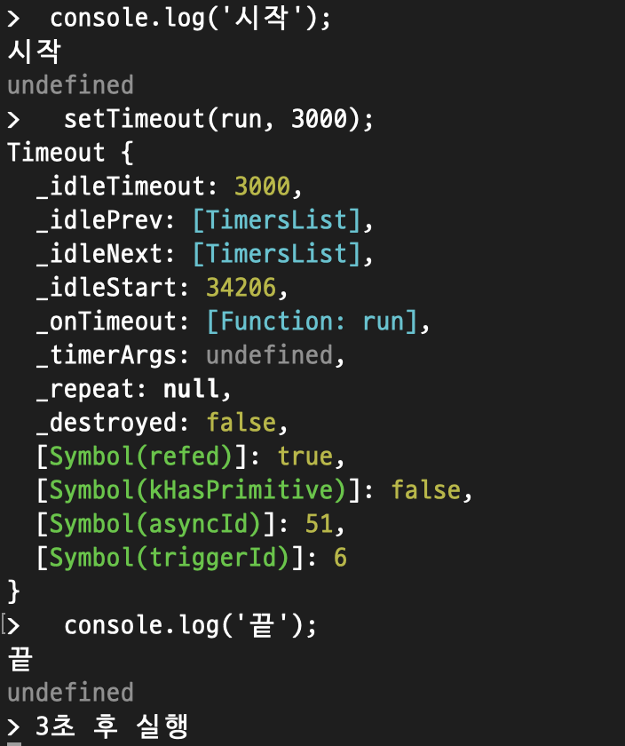 출력 결과: 시작 → 끝 → 3초 후 실행