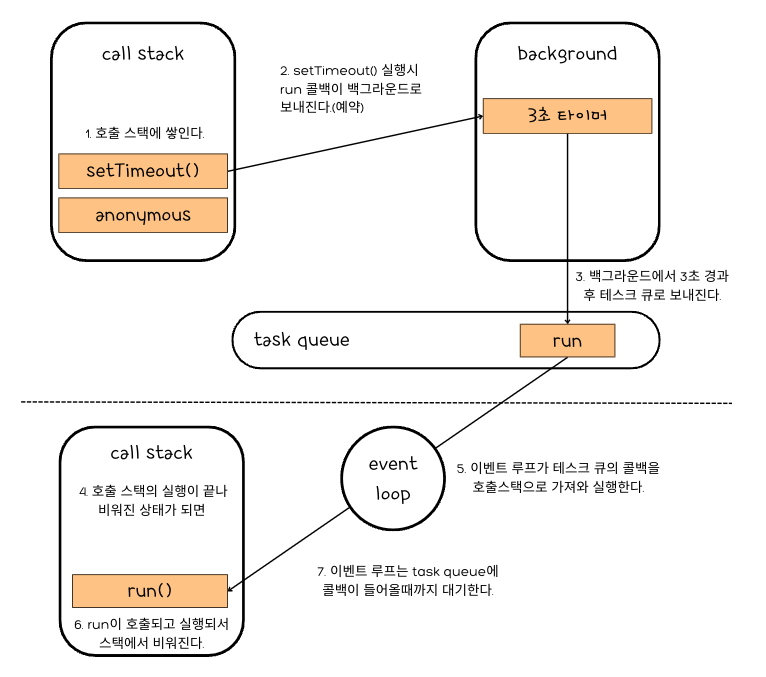 setTimeout은 비동기코드이기때문에 처리과정이 조금 더 복잡해진다.
