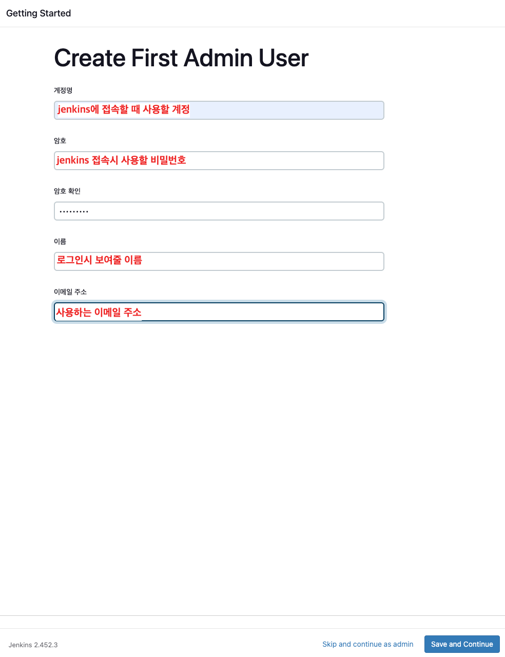 관리자계정을 생성하고 Jenkins URL 은 설정된 그대로 둡니다.