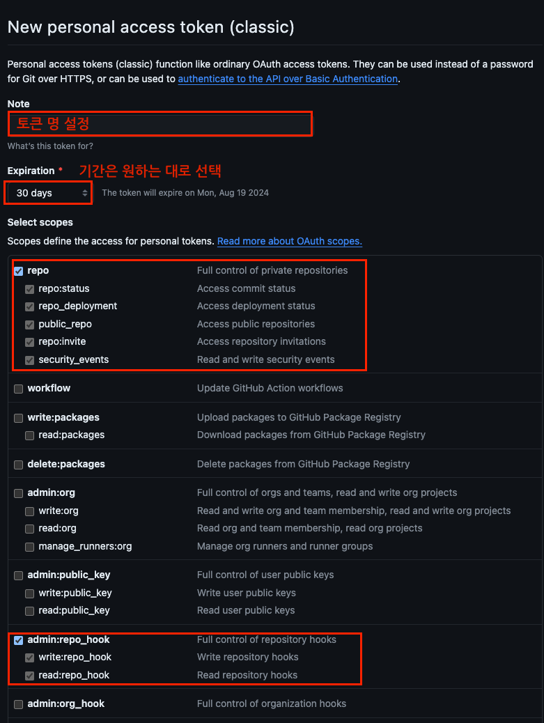 github hook과 jenkins를 연결하기위해 github Token을생성합니다.